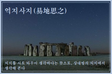 만일 모두가 상대방과 처지를 바꾸어서(易地), 생각해 본다면(思之) 대부분의 오해는 사라지고 살만한 세상이 될 것이다. 맹자(孟子)의 이루편(離婁編) 하에서 비롯됐다.