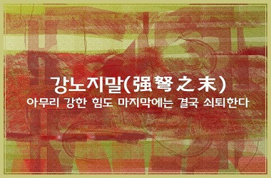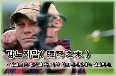 강노지말(强弩之末)이란 강한 화살도 나중에는 힘이 떨어짐, 즉 힘센 쇠뇌에서 튕겨나간 화살도 마지막에는 얇은 천 조차도 뚫지 못한다는 뜻으로, 강한 군사도 원정(遠征)을 가면 지쳐서 군력(軍力)이 약화(弱化)된다는 말이다.
