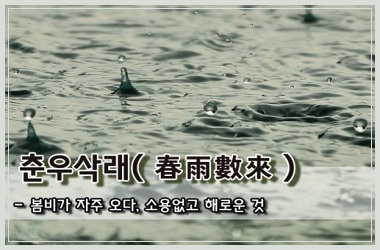 이런 좋은 계절 봄에 내리는 비는 어떨까. 봄에 비(春雨)가 자주 온다(數來)라는 성어는 한국에서 만들어졌다. 셈 수(數)는 촘촘한 그물 촉고(數罟)로 쓸 때는 ‘촘촘할 촉‘, 소변이 잦은 삭뇨증(數尿症) 할 때는 ’자주 삭’으로 읽힌다. 봄에 오는 비는 좋을 텐데 자주 오는 비는 의외로 아무런 유익함이 없이 해롭기만 하다는 뜻으로 썼다.