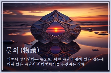 여기서 물의(物議)라는 말이 나왔다. 물의는 세상 사람들의 평판이나 뒷소문을 말한다. 지금은 주로 부정적인 뜻으로 쓰인다.