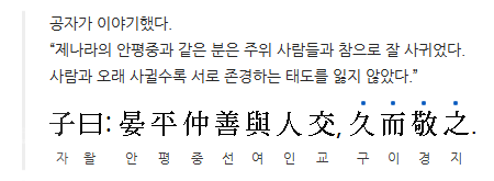 공자께서 말씀하셨다. "안평중은 남과 더불어 잘 사귄다. 사귄지 오래되어도 상대방을 여전히 공경하는구나."