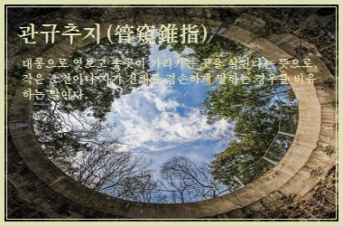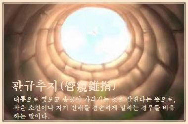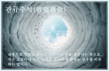 대롱으로 엿보고 송곳이 가리키는 곳을 살핀다는 뜻으로, 작은 소견이나 자기 견해를 겸손하게 말하는 경우를 비유하는 말이다.