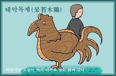 어리석은 모습이 마치 나무로 만든 닭과 같다는 뜻으로, 넋을 잃고 우두커니 있음을 비유한 말이다. 겉으로 보기에는 어리석어 보이지만 실제로는 매우 총명한 사람을 말하기도 한다.