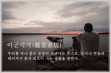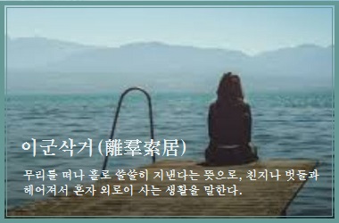 함께 있던 무리를 떠나(離羣) 홀로 쓸쓸히 지낸다(索居)는 이 성어도 고독하기는 마찬가지다. 이삭(離索)이라 줄여 말하기도 한다.