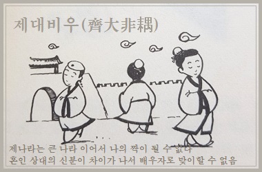 제(齊)나라는 대국이어서(齊大) 자신의 짝이 될 수 없다(非耦)는 이 성어는 상대방과 너무 신분의 차이가 커서 감히 배우자로 맞이할 수 없다는 것을 뜻하는 말이다. 耦는 쟁기 또는 가지런할 우인데 짝이라는 뜻도 있어 제대비우(齊大非偶)라 쓰기도 한다.