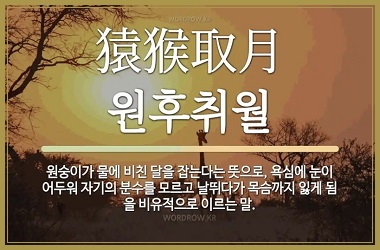 원숭이(猿猴)가 달을 잡는다는 뜻으로, 욕심에 눈이 어두워져 자기의 분수를 모르고 날뛰다가 목숨까지 잃는 것을 비유한 말이다. 동진(東晉)의 불교경전 마하승기율(摩訶僧祇律)에 나오는 말이다.