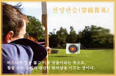 천양관슬(穿楊貫虱)은 화살로 버들잎을 꿰뚫는 양유기(養由基)와 이를 맞힌 (紀昌)이란 사람의 고사를 합쳐서 이뤄졌다.