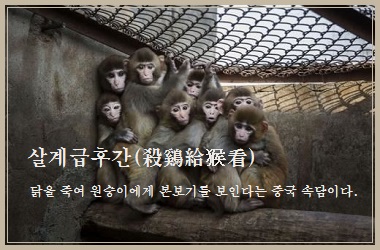 닭을 죽여(殺鷄) 원숭이에게 본보기가 되게 한다(儆猴)는 같은 뜻의 성어에는 다음 이야기가 따른다.
