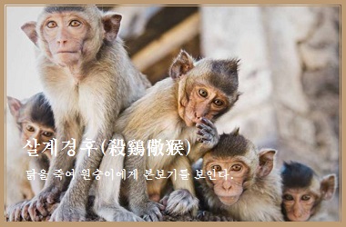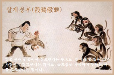 닭을 죽여 원숭이에 경고한다는 뜻으로, 한 사람을 벌해 다른 사람에게 경고한다는 의미로, 공포심을 자극하여 뜻하는 바를 도모한다는 말이다.