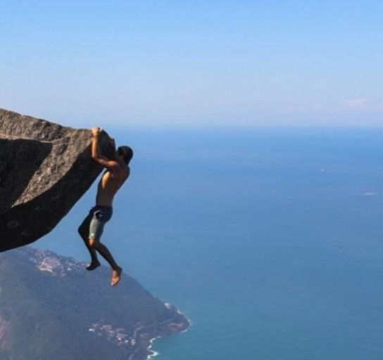 사실은 매달려 있는 지점이 지상에서 1m밖에 안 되는 높이지만, 이 사람은 아래를 쳐다보지 못하므로 수십m 높이에 매달려 있는 줄만 안다.