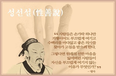 사람은 태어나면서부터 성품이 착하나 나쁜 환경이나 물욕으로 인해 악하게 된다. 맹자(孟子)의 성선설(性善說)이다.