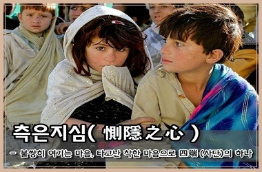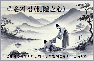 측은지심(惻隱之心)은 남의 불행을 불쌍히 여기고 함께 아파하는 마음으로, 맹자는 수오지심(羞惡之心) 사양지심(辭讓之心) 시비지심(是非之心)과 함께 사람이 가진 선천적 도덕능력이라고 강조했다.