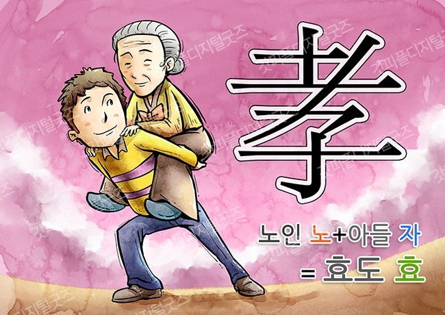 ▶️ 孝(효도 효)는 ❶회의문자로 耂(로; 노인)와 子(자; 아들)의 합자(合字)이다. 아들이 노인을 잘 봉양하는 뜻에서 부모나 조상을 잘 섬김을 나타낸다. ❷회의문자로 孝자는 ‘효도’나 ‘부모를 섬기다’라는 뜻을 가진 글자이다. 孝자는 耂(늙을 노)자와 子(아들 자)자가 결합한 모습이다. 子자가 耂자 아래에 있으니 글자의 구성으로만 본다면 아들이 노인을 등에 업은 것과도 같다. 그런데 금문에 나온 孝자를 보면 백발이 성한 노인과 어린아이가 함께 노니는 모습처럼 보이기도 한다. 어떻게 해석하든지 간에 어른을 모시고 함께하는 것이 孝의 근본이라는 것을 말하는 글자임은 틀림없다. 그래서 孝(효)는 (1)부모를 잘 섬기는 일 (2)성(姓)의 하나, 등의 뜻으로 ①효도(孝道) ②상복(喪服: 상중에 있는 상제나 복인이 입는 예복) ③제사(祭祀) ④맏, 맏자식 ⑤부모를 섬기다, 효도하다 ⑥본받다 ⑦상복(喪服)을 입다, 거상(居喪)하다 ⑧제사(祭祀) 지내다, 따위의 뜻이 있다. 용례로는 효성이 지극한 딸을 효녀(孝女), 부모를 잘 섬기는 마음을 효덕(孝德), 효행이 있는 며느리를 효부(孝婦), 효행이 있는 손자를 효손(孝孫), 효성스러운 마음을 효심(孝心), 부모에 대한 효도와 형제에 대한 우애를 효우(孝友), 효행을 다하는 마음을 효지(孝志), 부모를 잘 섬기고 공경함을 효경(孝敬), 부모의 은혜에 보답하기 위한 효도를 효은(孝恩), 어버이를 잘 섬기는 행실을 효행(孝行), 부모를 잘 섬기는 도리를 효도(孝道), 마음껏 어버이를 잘 섬기는 정성을 효성(孝誠), 효행이 있고 유순함을 효순(孝順), 어버이를 효행으로 봉양함을 효양(孝養), 어버이에게 효도함을 효친(孝親), 봉양할 줄 아는 새라는 뜻으로 까마귀를 달리 일컫는 말 효조(孝鳥), 부모에게 자식된 도리를 못함을 불효(不孝), 나라에 대한 충성과 부모에 대한 효도를 충효(忠孝), 어버이를 잘 섬김을 극효(克孝), 한결같고 변함없는 효도를 달효(達孝), 지극한 효도 또는 지극한 효자를 대효(大孝), 순종하여 효성을 다함을 순효(順孝), 어버이를 영화롭게 하는 효도를 영효(榮孝), 어버이의 애정과 자식의 효도를 자효(慈孝), 지극하고 돈후한 효행을 독효(篤孝), 부모를 섬길 때에는 마땅히 힘을 다하여야 함을 이르는 말을 효당갈력(孝當竭力), 효자는 날을 아낀다는 뜻으로 될 수 있는 한 오래 부모에게 효성을 다하여 섬기고자 하는 마음을 일컫는 말을 효자애일(孝子愛日), 효자가 난 가문을 일컫는 말을 효자지문(孝子之門), 어버이에 대한 효도와 형제끼리의 우애와 임금에 대한 충성과 벗 사이의 믿음을 통틀어 이르는 효제충신(孝悌忠信), 까마귀 새끼가 자란 뒤에 늙은 어미에게 먹이를 물어다 주는 효성이라는 뜻으로 자식이 자라서 부모를 봉양함을 일컫는 말을 반포지효(反哺之孝), 삼국 통일의 원동력이 된 화랑의 세속오계의 하나로 어버이를 섬김에 효도로써 함을 이르는 말을 사친이효(事親以孝), 부모는 자녀에게 자애로워야 하고 자녀는 부모에게 효성스러워야 함을 이르는 말을 부자자효(父慈子孝), 백유의 효도라는 뜻으로 어버이에 대한 지극한 효심을 일컫는 말을 백유지효(伯兪之孝), 부모에게 불효하는 일에 세 가지가 있다는 뜻으로 첫째 부모에게 영합하여 불의에 빠지게 하는 일 둘째 집이 가난하고 부모가 늙어도 벼슬하지 않는 일 셋째 장가가지 않고 자식이 없어 선조의 제사를 끊는 일의 세 가지를 일컫는 말을 불효유삼(不孝有三), 효자가 죽은 부모를 너무 슬피 사모하여 병이 나고 혹은 죽음을 일컫는 말을 이효상효(以孝傷孝), 항상 부모의 뜻을 받들어 마음을 기쁘게 해드리는 효행을 일컫는 말을 양지지효(養志之孝), 하늘이 낸 효자라는 뜻으로 지극한 효성을 이르는 말을 출천지효(出天之孝) 등에 쓰인다.