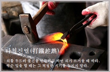 쇠를 두드려 물건을 만들려고 하면 쇠가 뜨거울 때 하라는 뜻으로, 무슨 일을 할 때는 그 적절한 시기를 놓치지 말라는 말이다.