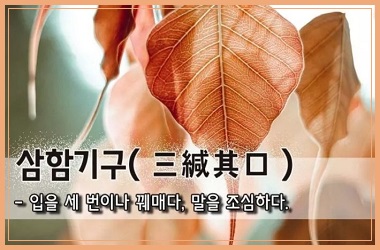 그 입을 세 번이나 꿰맸다는 뜻으로, 말을 경계하라는 말이다. 절의 큰방 뒷벽에 써서 붙여서 보는 이로 하여금 몸과 입과 뜻의 세 가지를 삼가게 하는 글이다.