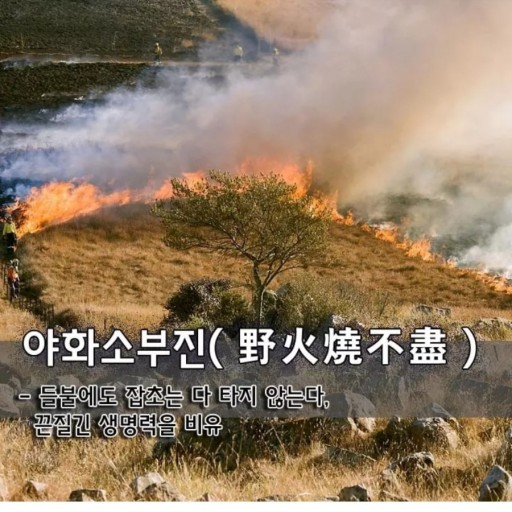 들판의 잡초를 태우기 위해 들불을 놓아도(野火) 다 태울 수 없다(燒不盡)는 이 성어는 당(唐)나라의 대시인 백거이(白居易)의 시구에서 왔다. 다함없는 생명력처럼 가시지 않는 친구에 대한 그리움을 나타냈다.