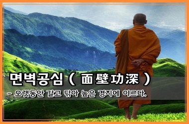 중국 선종(禪宗)의 창시자인 달마(達磨)가 쑹산[嵩山] 소림사(少林寺)에서 9년간 면벽좌선(面壁坐禪)하면서 높은 경지에 올랐다는 고사에서 유래한 성어(成語)이다.