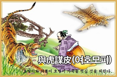 호랑이와 호랑이 가죽을 벗기는 일을 의논한다는 뜻으로, 요구하는 일이 상대방의 이해와 상충하여 이루어질 수 없음을 비유하는 말이다.