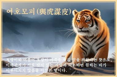 호랑이와 더불어 호랑이 가죽을 벗길 것을 꾀한다는 뜻으로, 이해관계가 서로 맞지 않는 사람과 의논하면 원하는 바가 이루어지지 않음을 이르는 말이다. 요구하는 일이 상대방의 이해와 상충하여 이루어질 수 없음을 비유하는 말이다. 근본적으로 이룰 수 없는 일을 의미한다. 이 성어는 태평어람(太平御覽) 권208 직관부(職官部) 사도하(司徒下)의 이솝 우화(寓話)와도 같은 이야기에서 연유한다.