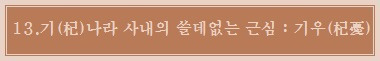 기(杞)나라의 어떤 사람이 하늘과 땅이 무너져서 떨어지면, 몸이 의지할 데가 없어질 것을 근심하여 침식을 폐하는 자가 있었다.