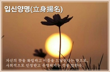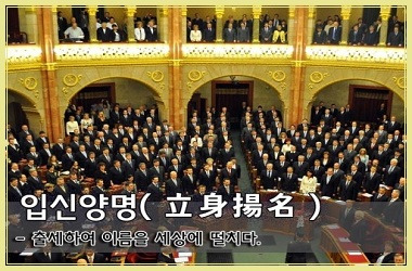 출세하여 이름을 세상에 떨친다는 뜻이다. 원래는 세상을 위해 좋은 일을 한다는 뜻이 강했다. 그러나 입신양명의 좋은 취지는 변질돼 이미 조선조에서 부터 오늘날과 같은 의미의 출세주의를 뜻하게 되었다.