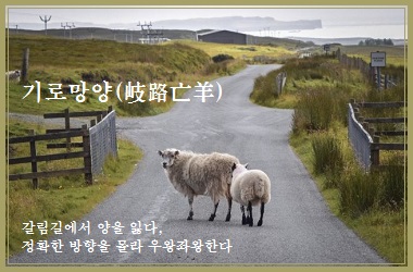 가는 길이 여러 곳으로 통하지만 어리석거나 모험심이 강한 사람이 아니고선 일부러 둘러 가는 어려운 길을 택할 필요는 없다. 여러 갈래난 갈림길(岐路)에서 양을 잃는다(亡羊)는 말은 정확한 방향을 몰라 오락가락하는 것을 뜻한다.
