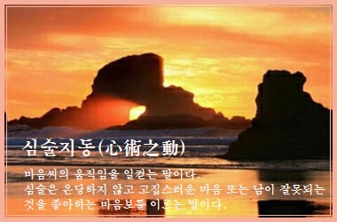 다른 사람도 내 심술을 살피니 마땅히 스스로를 살피려고 날이면 날마다 ‘성실(誠實)’로 노력해야 할 것이다. 그래야지 사람들이 ‘나’를 따르고 인생과 비즈니스가 ‘술술술 풀리기’ 때문이다. 하여 자기부터 사랑할 일이다. 그래서다. 자기의 마음을 생각하지 못하고 헤아리지 못하면서 상대를 대하면 무시당하는 거다. 그런 거다.