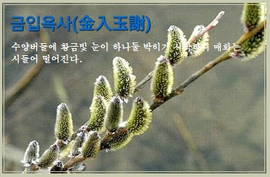 오련한 옥색 청매가 피어서는 봄비에 지나 싶더니 수양버들에 황금빛 눈이 하나둘 박히기 시작한다. 이렇게 해서 겨우내 우중충하던 버들가지가 눈록(嫩綠)의 황금빛을 띠면 이제 곧 봄이 시작된다는 뜻이다.
