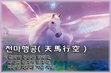 천마가 공중을 달린다는 뜻으로, 서예의 글씨가 힘차다. 또는 비상한 재주를 가진 사람을 비유하여 이르는 말이다.