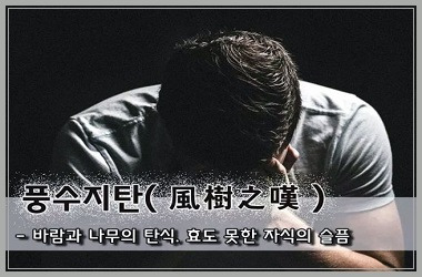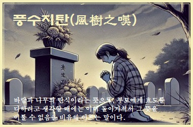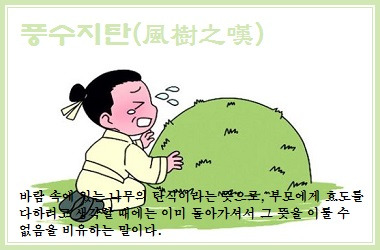 풍수지탄(風樹之嘆)에서 風은 바람 풍, 樹는 나무 수, 之는 갈 지, 嘆은 탄식할 탄으로 '바람 속에 있는 나무의 탄식'이라는 뜻으로, 한(漢)나라 사람 한영(韓嬰)이 쓴 시경(詩經)의 해설서인 한시외전(韓詩外傳)에 나오는 구절이다. 부모에게 효도를 다하려고 생각할 때에는 이미 돌아가셔서 그 뜻을 이룰 수 없음을 비유하는 말이다.