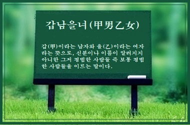 갑(甲)이라는 남자와 을(乙)이라는 여자라는 뜻으로, 신분이나 이름이 알려지지 아니한 그저 평범한 사람들 즉 보통 평범한 사람들을 이르는 말이다.