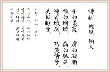 手如柔荑, 膚如凝脂, 領如蝤蠐, 齒如瓠犀, 螓首蛾眉, 巧笑倩兮, 美目盼兮.