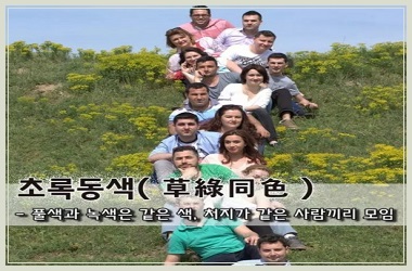 이와는 반대로 비슷한 것끼리 한편이 되는 것을 초록동색(草綠同色)이라 한다. 초록동색(草綠同色)이라는 성어는 같은 처지에 있는 사람들끼리 어울리거나 기우는 것을 의미한다. 사람들이 서로의 처지를 이해하고 지지하는 경우에 사용한다. '풀빛과 녹색이 같은 빛깔'이라는 뜻이다. 그러니 옳고 그름과는 관계없이 편을 든다는 것이다.