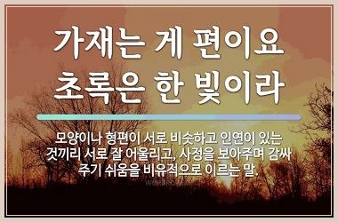 '가재는 게 편', '솔개는 매 편', '이리가 짖으니 개가 꼬리를 흔든다', 흑구축체(黑狗逐彘)로 한역한 '검정개는 돼지 편' 등이다. 조금 비하한 느낌이지만 인격이나 학식이 비슷한 사람끼리 모이고 사귄다는 비유다. 이들보다 더 자주 사용하여 입에 익은 것이 풀의 색깔과 초록색(草綠)은 한 가지 색(同色)이란 성어다.