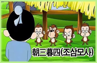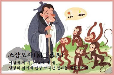 원문 그대로 해석하면 ‘아침에 세개를 주고 저녁에 네개를 준다’는 뜻인데 송나라 저공(狙公)과 원숭이들 간의 우화에서 나온 이야기다.