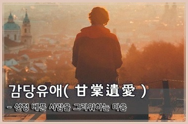 감당나무에 남겨진 사랑이라는 뜻이다. 이 표현은 은나라 주공(周公)의 덕을 기리는 고사에서 비롯되었다. 시경(詩經) 국풍(國風) 소남편(召南篇)에 등장하는 구절인 감당(甘棠)은, 주공이 정치를 베풀고 떠난 뒤 백성들이 그가 머물던 감당나무 아래를 아끼고 베지 않았다는 내용이다. 여기서 감당나무는 주공의 은혜와 덕정의 상징이 되었고, 나무를 통해 그를 기리는 마음을 나타낸 것이다.