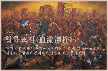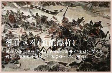 피가 강물처럼 흘러 절굿공이가 떠다닌다는 뜻으로, 엄청난 사상자를 내는 참혹한 전쟁 또는 대학살을 비유하는 고사성어이다. 서경(書經)에서 유래되었다.