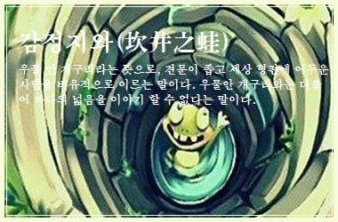 구덩이 속의 개구리로 식견(識見)이 좁은 사람을 비유할 때 쓰이는 말이다. 이 감정지와 성어는 순자(荀子) 장자(莊子)에 나오는 성어지만 우리선현들이 남긴 문집 안에서도 즐겨 쓰이는 성어로서 조선시대 편찬된 동문선(東文選)에 고려시대의 문신 학자 김부식(金富軾)선생의 세 번째 사직 상소인 삼사표(三辭表)에 그 용례가 있어 그 중 한 구절을 발췌하여 소개하여 본다.