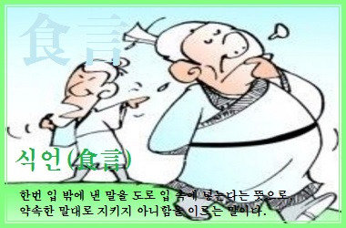 한번 뱉은 말은 삼킬 수가 없다. 그런데 자기가 한 말을 다시 꿀꺽 먹어치우는 사람이 있다. 분명히 자기가 말하여 놓고, 내가 언제 그랬냐고 시치미를 뚝 떼거나, 기억나지 않는다며 고개를 갸웃한다. 이런 것을 두고 식언(食言)을 일삼는다고 한다. 말은 밥이 아니지만, 자꾸 먹어 대면 사람이 탐욕스럽게 된다.