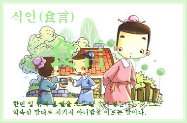 식(食)은 ‘먹다’는 뜻이고, 언(言)은 ‘말’이다. 즉, 이 말은 음식이 입 안에서 없어지는 것처럼 한번 한 말을 지키지 못함을 이른다. 말이란 일단 입 밖에 나오면 도로 담아 넣을 수 없다. 실행한다는 행(行)은 걸어간다는 뜻이다. 자기가 한 말을 그대로 밝고 걸어가는 것이 실천이요, 실행이다. 그런데 밟고 걸어가야 할 말을 다시 먹어버렸으니 실천과 실행이 있을 수 없게 된다.