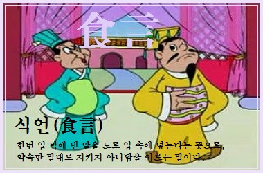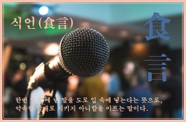 식언(食言)은 말을 내뱉고 그 말을 주워담는 행위다. 거짓말의 의도를 담았다는 것보다는 자신의 말을 지키지 않고 거두거나 다른 말로 바꾸는 경우를 말한다. 따라서 처음에는 대중이나 상대방에게 약속했던 것도 아니라고 말하고 상대방이 믿고 있는 구체적인 사실이 아닌 엉뚱한 해답이 정답이라고 우기는 경우다. 또한 자신의 것을 내놓는다고 해놓고 나중에 기억나지 않는다는 등의 변명으로 일관하며 자신과 남 사이의 약속을 헌신짝 처럼 버리는 상황이다.