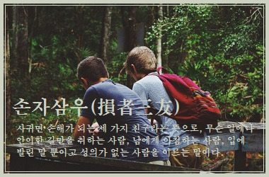 공자(孔子)는 사귀어서 이익이 되는 친구가 세 부류가 있고(益者三友), 사귀어서 손해가 되는 친구 역시 세 부류가 있다(損者三友)고 했다.