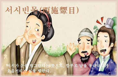 월(越)나라의 유명(有名)한 미인(美人) 서시(西施)가 눈을 찌푸린 것을 아름답게 본 못난 여자(女子)가 그 흉내를 내고다녀 더욱 싫게 보였다는 고사에서 유래(由來)한 말로, 분수(分數)를 생각하지 않고 무조건(無條件) 남을 따라하는 것을 비유(比喩)하는 말이다.