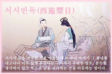 서시가 하는 일이라면 눈살을 찌푸리는 것 마저 흉내낸다는 뜻으로써 남의 단점을 장점인 줄 알고 흉내내어 세상의 웃음거리가 됨을 비유하는 말이다. 요즘 잘나가는 연예인들을 따라다니며 그들의 일거수일투족을 흉내내는 빠순이, 빠돌이 들에게 썩 어울리는 고사성어라고 할 수 있겠다.