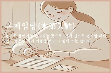 부모님께 편지를 보낼 때 부모님의 함자를 함부로 쓰기 죄송하여 자신의 이름을 쓰고 본제입납(本第入納) 부기하는 것으로 이름 쓴 이의 본가(本家)로 보내 달라는 뜻이다. 이것은 편지의 주소란에 쓰는 말입니다. 아무나 쓸 수 있는 것이 아니고, 객지에 나와 있는 자식이 고향의 집에 계신 부모님께 편지를 쓸 때 겉 봉투에 그렇게 써서 보내는 것이 예의였습니다.