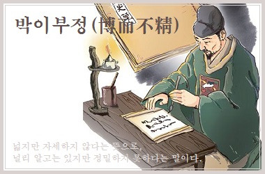 이 성어는 많이 알고 있는 것 같은데 한 가지 전문 지식이나 능숙한 면이 없다는 말로 사전에는 널리 알지만 정밀하지는 못함 이라고 뜻을 적고 있다. 박(博)은 ‘넓음’의 뜻이고, 이(而)는 이 구절에서 앞말을 부정적으로 이어 주는 구실을 한다. 그러므로 박이(博而)는 ‘넓지만’ 으로 해석할 수 있다. 정(精)은 ‘정밀함’, ‘자세함’의 뜻이다. 그러므로 넓게 알지만 자세히는 모름, 즉 깊이가 없음을 가리키는 말이다.