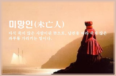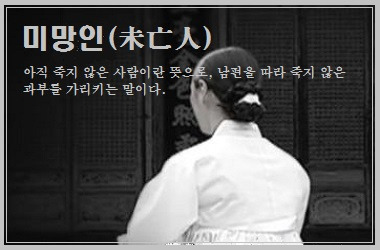 남편이 죽으면 따라 죽는 것이 미덕으로 여겨지던 사회속에서의 미망인이 그 전형적인 사례라 할 수 있습니다. 열녀라는 말로 과대포장 되고 미풍양속이란 말로 미화되었던 과거의 모습중에서 삶의 주체가 아닌 종속된 삶을 강요당했던 많은 여성들의 슬픈 모습이 확인됩니다. 미망인이란 말을 통해서 그 아픈 과거의 모습이 떠오릅니다.