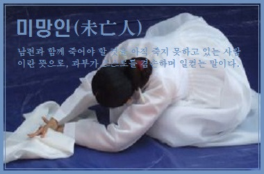 지금도 쓰이고 있는 미망인이란 말만 해도 그렇다. 미망인은 '아직 죽지 않은 사람'이라는 뜻이니, 남편이 죽었으면 마땅히 따라 죽어야 하는데 왜 죽지 않고 있느냐는 질책이 그 이면에 깔려 있다. 그렇게 보면, 미망인이란 '아직 죽지 않고 있는 사람'이란 뜻이 된다.