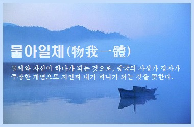 이는 물아일체의 사고로도 연관되어 진다. 사전적 의미로 물아일체란 자연물과 자아가 하나가 된다는 뜻으로 대상에 완전히 몰입된 경지를 나타낸다. 이로써 자연을 바라본다면 자연이 조화를 이루었을 때 더욱 아름다워지고 이에 따라 인간의 삶도 더욱 건강해 진다는 것이다. 자연의 개발을 전면 거부하는 것이 아니라 자연의 생태와 미적 균형을 유지하는 한도 내에서 가급적 거스르지 않으려는 논리이다. 이처럼 동양에서는 자연에 동화된 인간이 자연을 스승으로 삼고 자연의 이치를 순리로 여겼다.