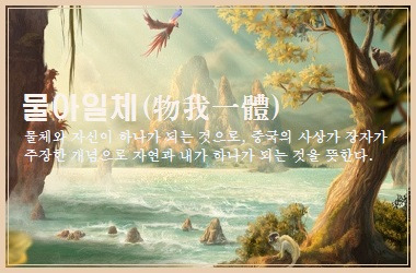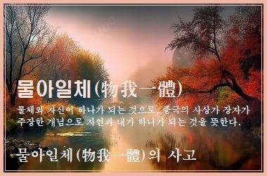 물아일체(物我一體)는 인간과 자연, 그리고 우주가 하나라는 개념을 표현합니다. 이는 개인의 자아가 우주의 다른 모든 것과 본질적으로 구분되지 않는다는 사상을 내포하고 있습니다.